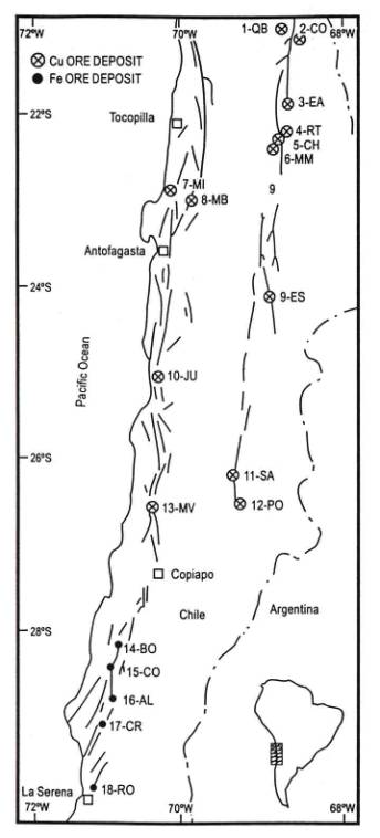 FIG. 10: Major iron and copper deposits structurally related to the Atacama and the Domeyko fault zones in Northern Chile. Slightly modified after Sillitoe et al., 1996 and Vila et al., 1996.