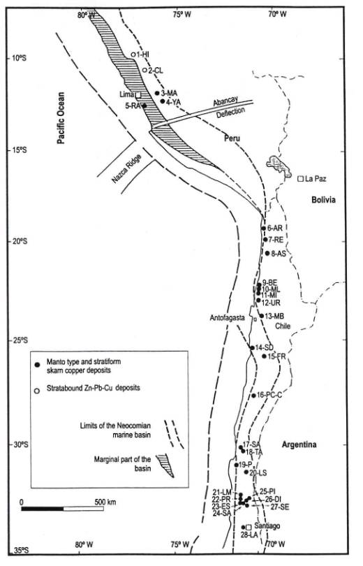 deposits in Mesozoic volcano-sedimentary rocks of Perú and Chile. List of