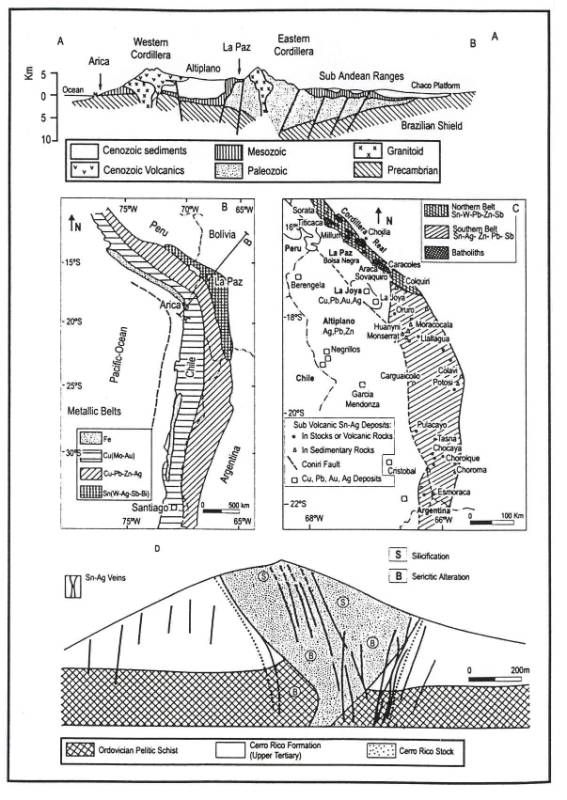 FIG. 8: The tin belt of Bolivia and the Cerro Rico tin-silver deposit. Slightly modified after James, 1971 (A); Sillitoe, 1972, 1976 (B); Turneaure, 1960 (C) and Turneaure, 1971 (D).